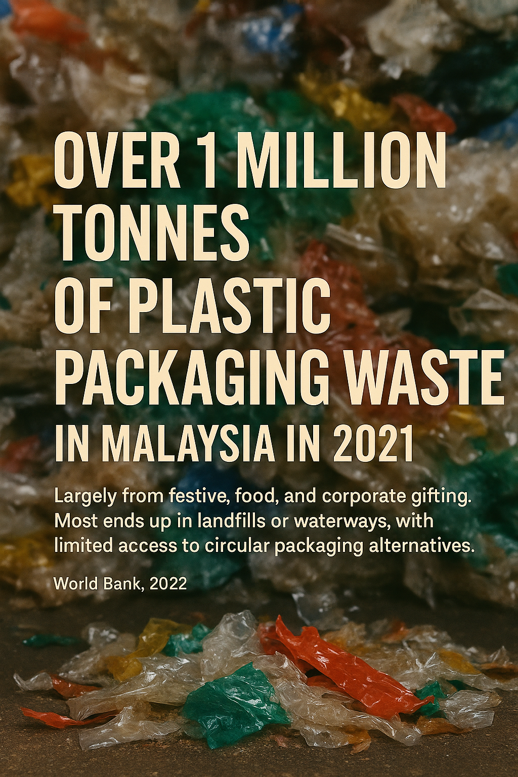 Malaysia generated over1 million tonnesof plastic packaging waste in 2021 (World Bank, 2022), much of it from festive, food, and corporate gifting. Most ends up in landfills or waterways, with limited access to circular packaging alternatives.